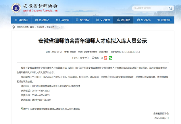 安徽省律師協(xié)會青年律師人才庫是依據(jù)《安徽省律師協(xié)會青年律師人才庫管理辦法(試行)》建立的重要人才培養(yǎng)平臺,旨在優(yōu)化安徽省律師隊(duì)伍結(jié)構(gòu),聚焦專業(yè)化發(fā)展和業(yè)務(wù)創(chuàng)新,著力培養(yǎng)后備領(lǐng)軍人才,提升行業(yè)整體引領(lǐng)力。