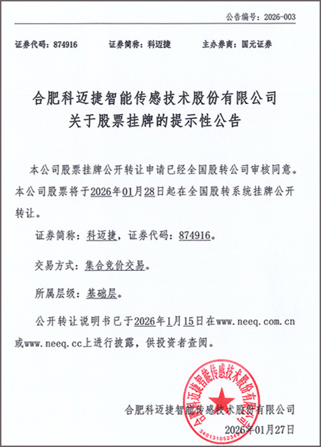 2026年1月28日,合肥科邁捷智能傳感技術(shù)股份有限公司 (簡(jiǎn)稱(chēng):科邁捷,證券代碼:874916)成功在全國(guó)中小企業(yè)股份轉(zhuǎn)讓系統(tǒng)掛牌,成為2026年安徽首家新三板掛牌企業(yè),也是安徽首家正式登陸境內(nèi)全國(guó)性資本市場(chǎng)的企業(yè)。