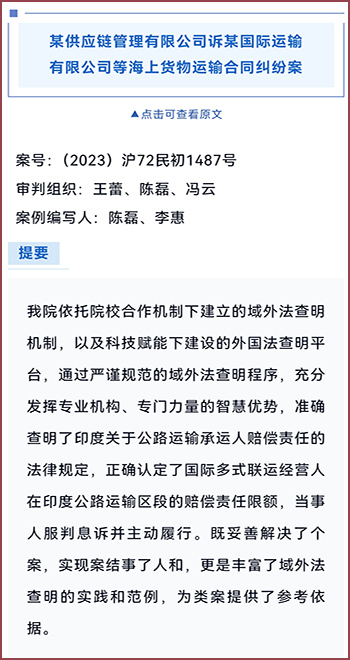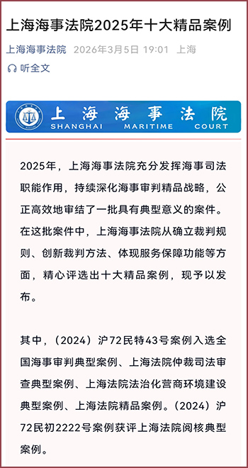 近日,上海海事法院發(fā)布2025年度十大精品案例,由安徽天禾律師事務(wù)所合伙人畢晨律師代理的某供應(yīng)鏈管理有限公司訴某國際運(yùn)輸有限公司等海上貨物運(yùn)輸合同糾紛案【案號:(2023)滬72民初1487號】成功入選。該案系國際多式聯(lián)運(yùn)領(lǐng)域涉及域外法查明與法律適用的典型案件,為同類涉外海事糾紛的處理提供了實(shí)踐范本,充分展現(xiàn)了天禾所在高端涉外海事法律服務(wù)領(lǐng)域的專業(yè)素養(yǎng)與實(shí)務(wù)能力。
