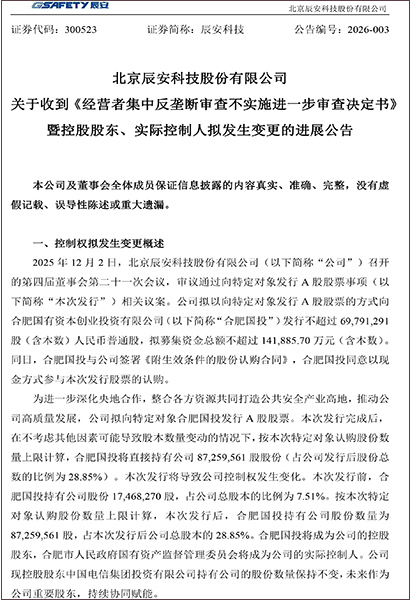 本次收購是合肥市引入高端產(chǎn)業(yè)資源、提升城市公共安全綜合能力的關鍵部署。交易完成后,雙方將充分發(fā)揮辰安科技在公共安全與應急管理領域的技術優(yōu)勢,結合合肥本地場景資源與布局,共同推動公共安全產(chǎn)業(yè)升級,助力合肥打造全國影響力的公共安全產(chǎn)業(yè)高地。