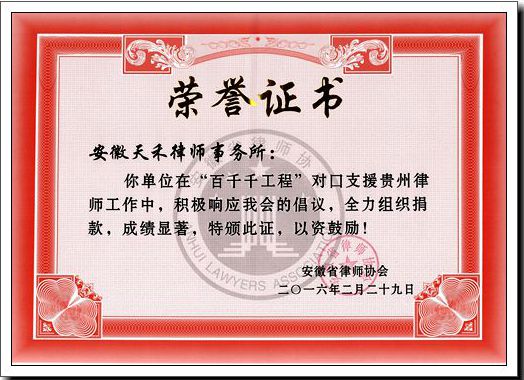 近日,安徽省律師協(xié)會向本所頒發(fā)榮譽(yù)證書,表彰本所在“百千千工程”對口支援貴州律師工作中,積極響應(yīng)省律協(xié)倡議,全力組織捐款,成績顯著。