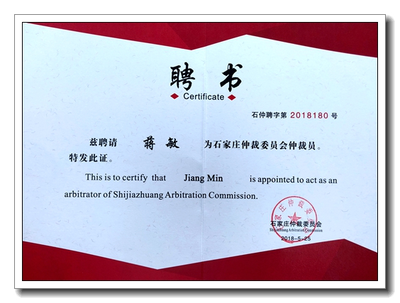 日前,本所合伙人蔣敏被石家莊仲裁委員會聘為仲裁員,任期三年。