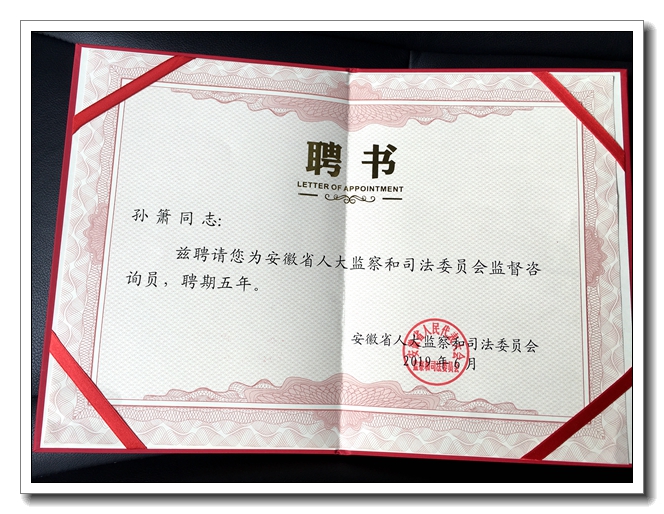 孫簫律師受聘擔(dān)任省人大監(jiān)察和司法委員會監(jiān)督咨詢員