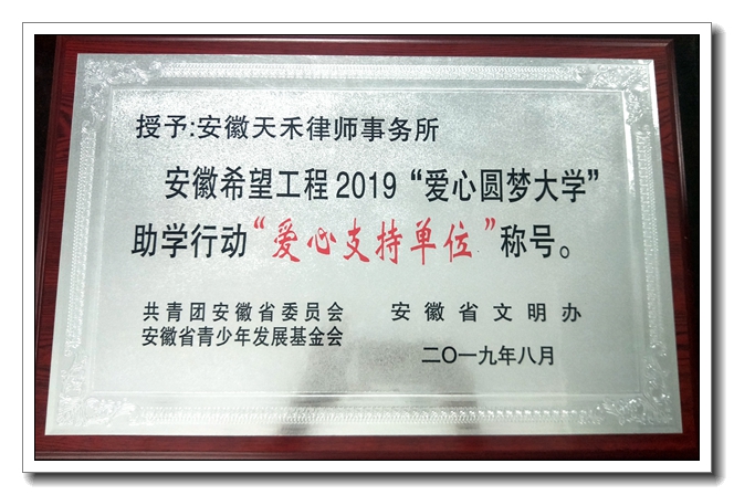 天禾所榮獲安徽希望工程2019“愛心圓夢大學(xué)”助學(xué)行動“愛心支持單位”稱號