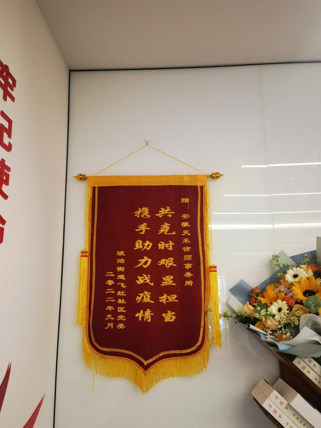張海波表示,天禾所黨委積極響應(yīng)市直機(jī)關(guān)下沉志愿服務(wù)的倡議,主動(dòng)承擔(dān)社會(huì)責(zé)任,迅速組建由天禾所黨員律師、青年律師參加的防疫志愿隊(duì),自4月7日持續(xù)配合社區(qū)開(kāi)展防疫志愿服務(wù),為打贏疫情防控的人民戰(zhàn)爭(zhēng)貢獻(xiàn)了力量。他代表街道和社區(qū),感謝天禾所為抗疫作出的貢獻(xiàn)和對(duì)飛虹社區(qū)工作的大力支持。 這面錦旗,飽含著社區(qū)對(duì)天禾所抗疫志愿服務(wù)的極大肯定,是榮譽(yù)、是動(dòng)力、更是責(zé)任,下一步,天禾所將繼續(xù)以實(shí)際行動(dòng)彰顯新時(shí)代律師的擔(dān)當(dāng)與作為,盡職盡責(zé),保持高昂斗志,為疫情防控阻擊戰(zhàn)作出自己的一份貢獻(xiàn)。
