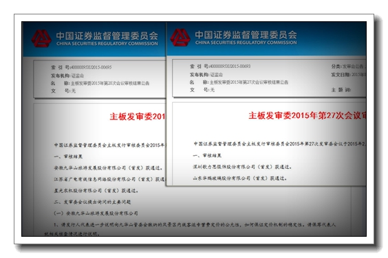 新年伊始,天禾所業(yè)務(wù)捷報(bào)頻傳。2015年2月11日,中國證券監(jiān)督管理委員會主板發(fā)行審核委員會召開第27次、第28次發(fā)審委會議,由天禾律師事務(wù)所擔(dān)任發(fā)行人律師的山東華鵬玻璃股份有限公司、安徽九華山旅游發(fā)展股份有限公司等兩公司首發(fā)分別獲審核通過。