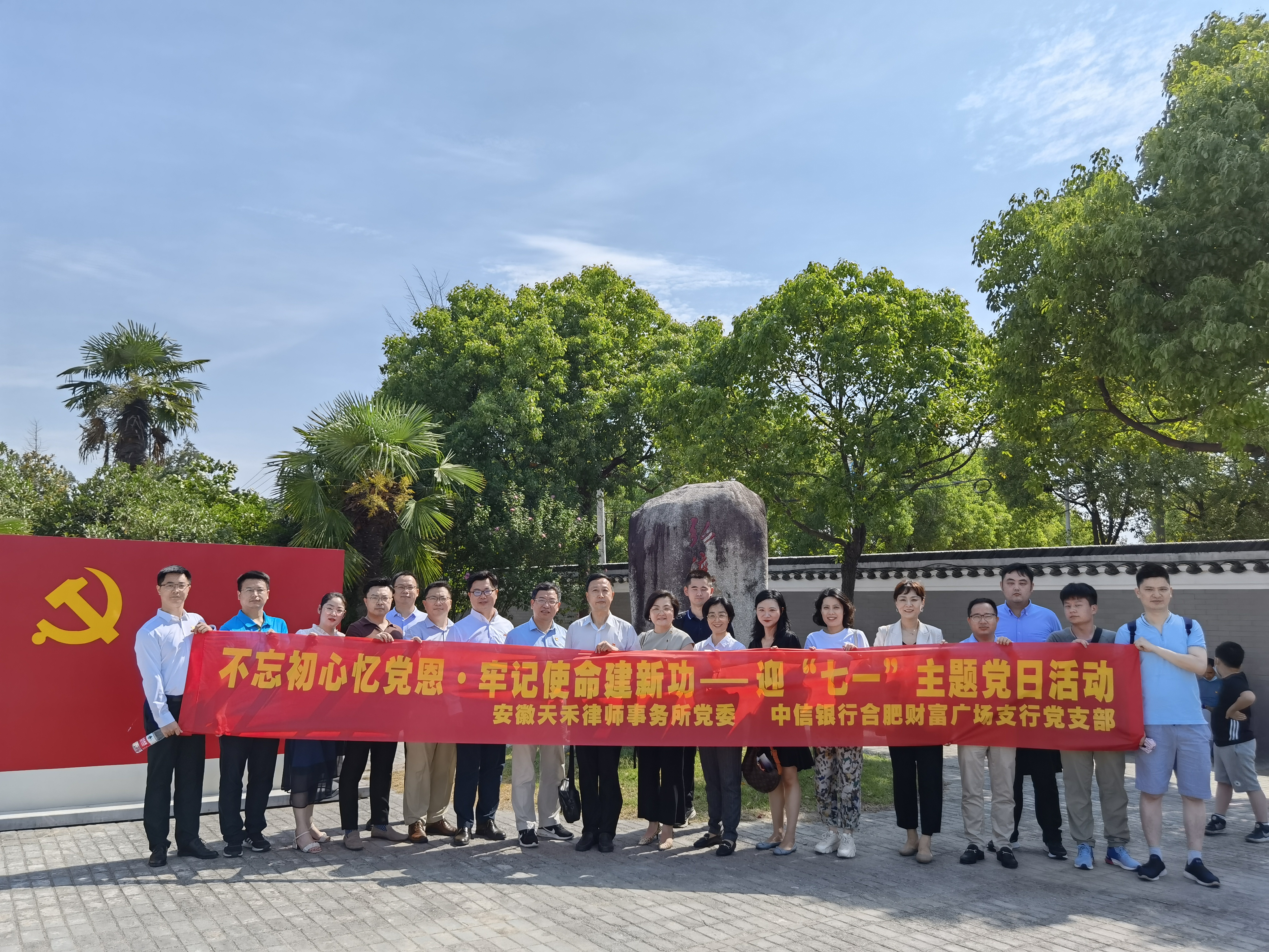 為了慶祝建黨101周年,2022年6月26日安徽天禾律師事務(wù)所黨委與中信銀行財(cái)富廣場(chǎng)支行黨支部聯(lián)合開(kāi)展“不忘初心憶黨恩、牢記使命建新功”的革命傳統(tǒng)教育主題黨日活動(dòng),并赴渡江戰(zhàn)役總前委舊址紀(jì)念館參觀,接受革命傳統(tǒng)教育,推動(dòng)黨史學(xué)習(xí)教育取得實(shí)效。