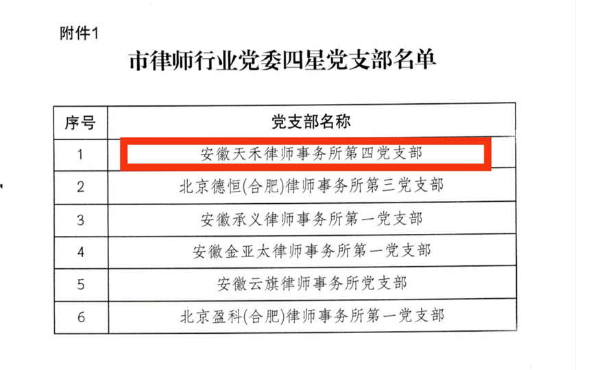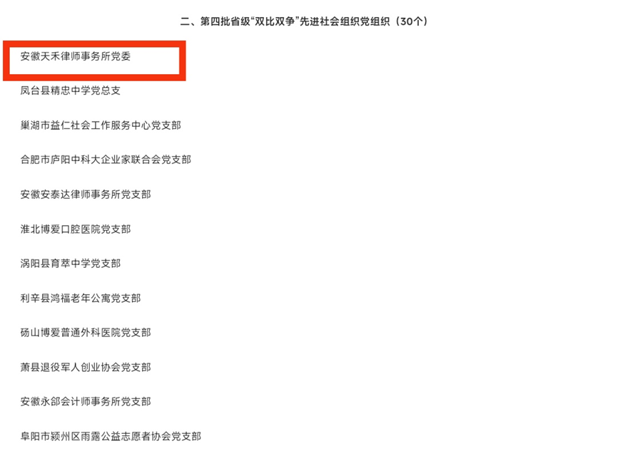 日前,天禾所黨組織先后榮獲省級(jí)、市級(jí)兩項(xiàng)黨建榮譽(yù)稱號(hào)。其中天禾所黨委喜獲“第四批省級(jí)‘雙比雙爭(zhēng)’先進(jìn)社會(huì)組織黨組織”榮譽(yù)稱號(hào);天禾所第四黨支部被評(píng)為“2022年度合肥市律師行業(yè)黨委四星黨支部”。